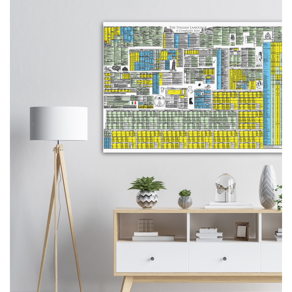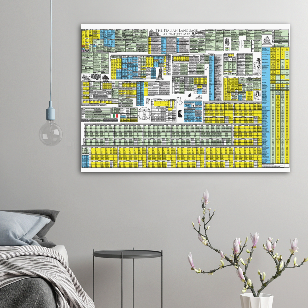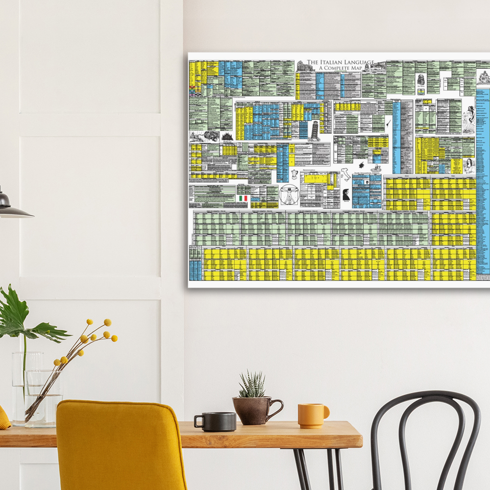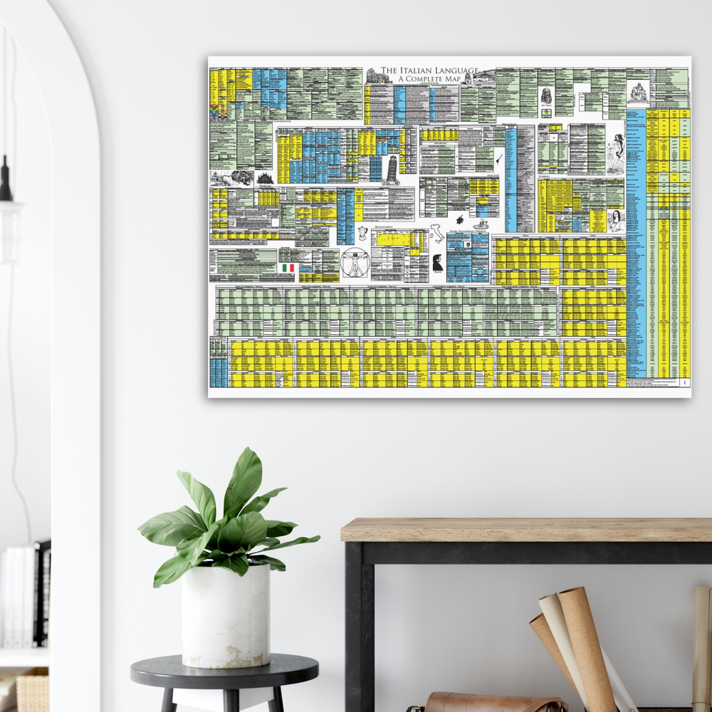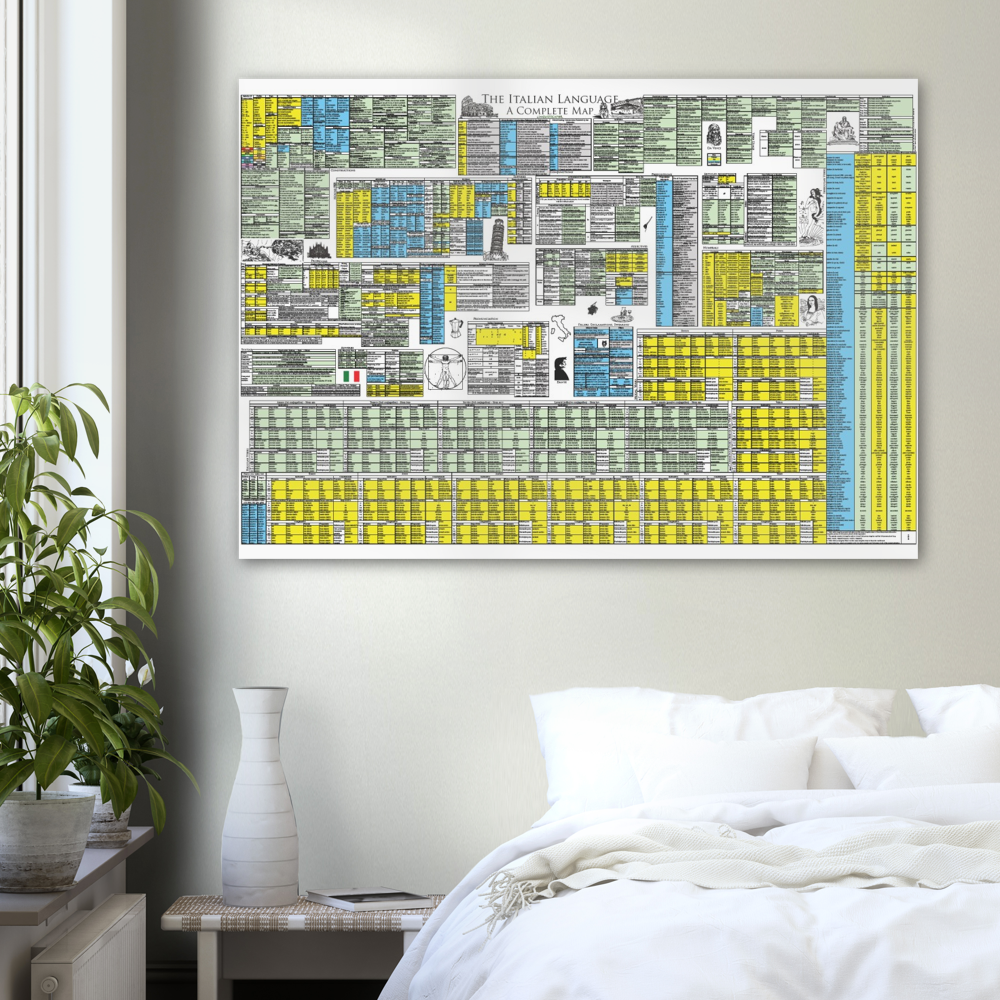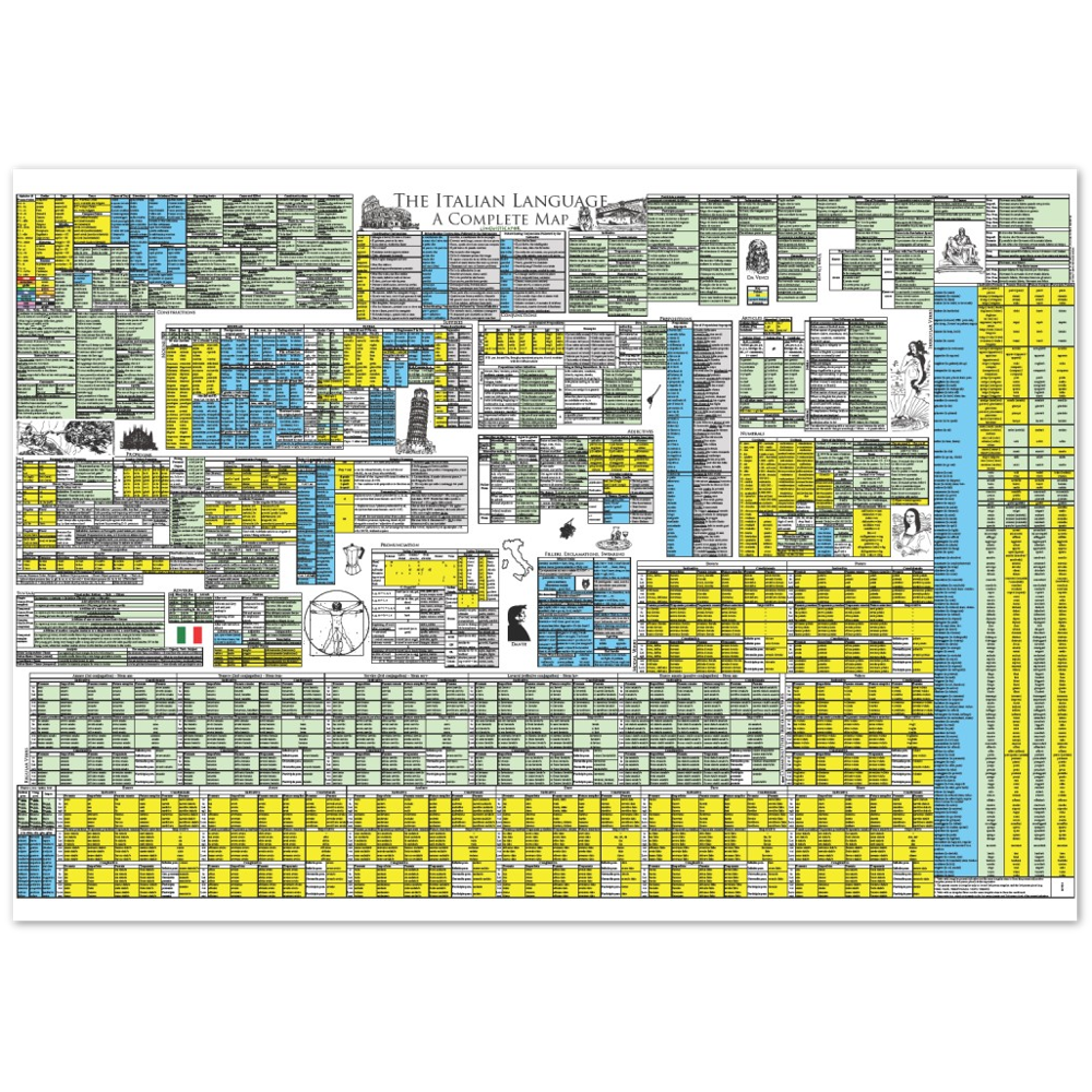 This complete map of Italian includes all Italian grammar in a single compact and beautifully presented map. The map serves as the full review to Linguisticator's online video course in Italian, which explores and explains this map in detail and teaches how to use spatial memory systems – or memory palaces – to learn all of its content. One of the most challenging aspects of Italian is its verbal system, which is presented in its entirety on this map, including all conjugations of the regular and auxiliary system, as well as an exhaustive list of irregular verbs grouped by pattern. Also learn how to tell the genders of nouns – even the ones that behave abnormally – how to use the different pronouns, and how to use various syntax patterns and constructions. The map of Italian is printed on high quality A0-sized paper and accompanies Linguisticator’s online courses.